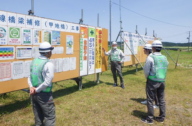 社内で組織されたパトロール員が各現場を巡回し、安全、衛生環境などを確認しています。現場では、現場担当者より施工状況を説明を受け、各現場の優良点、改善点などを話し合い後日、文書にして社員全員で共有し、今後の工事に反映していきます。今後も無事故、無災害を目指します。