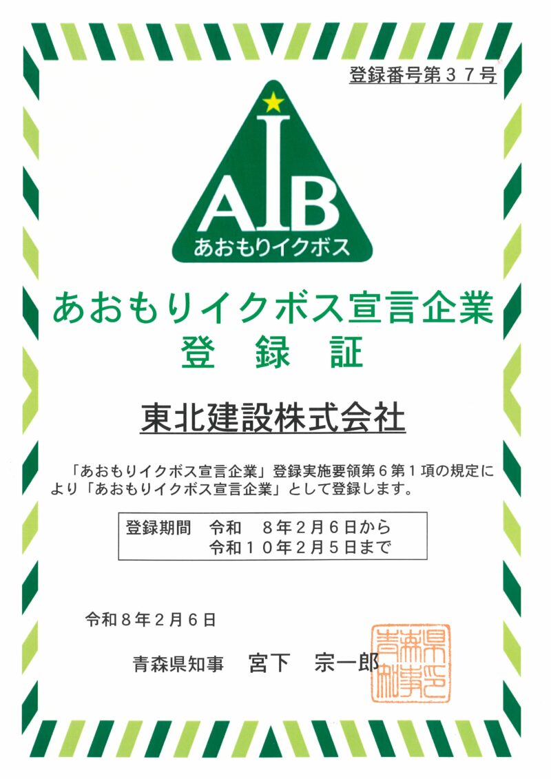 東北建設株式会社では、青森県庁に「あおもりイクボス宣言企業」として登録しています。 「あおもりイクボス宣言企業」とは、職員の仕事と私生活との両立(ワークライフバランス)を 推進する企業のことです。 弊社の社長自らが「イクボス宣言」を行い、社員同士でコミュニケーションをとり、働きやすい 職場づくりに取り組んでいます。 弊社では今後も、社員一人ひとりが安心して働き続けられる職場づくりを目指し、より良い職場 環境の整備に努めてまいります。