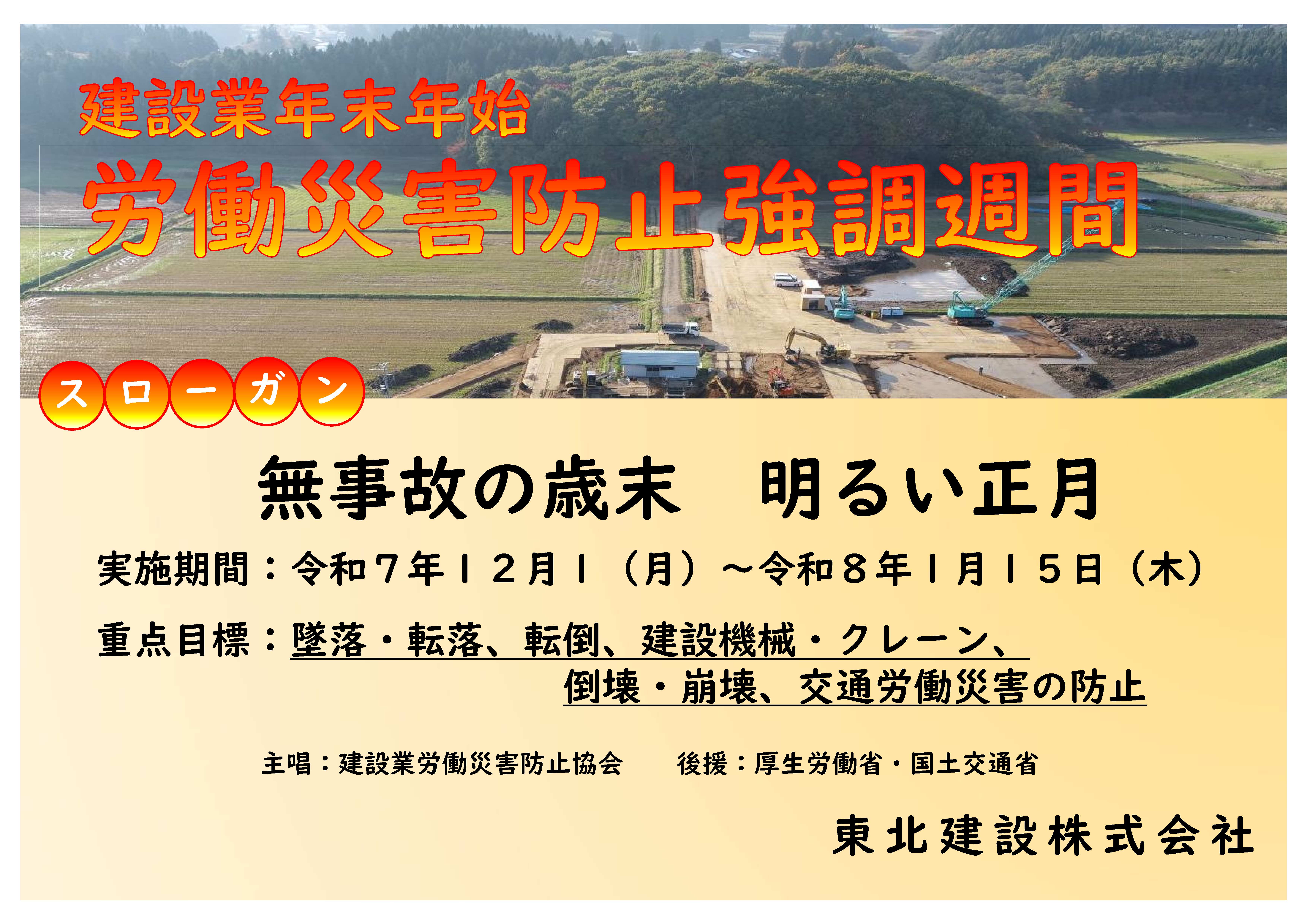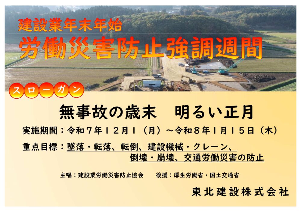 2025.12.01 News 建設業年末年始労働災害防止強調期間が始まります。 年末年始は、長期の休業前の慌ただしい中での作業や休業後に生活リズムが戻らない中で作業が行われる事があるなど、労働災害の発生リスクが 高まることが懸念されます、「無事故の歳末 明るい正月」のスローガンのもと、当社も無事故・無災害を目指して頑張ります。