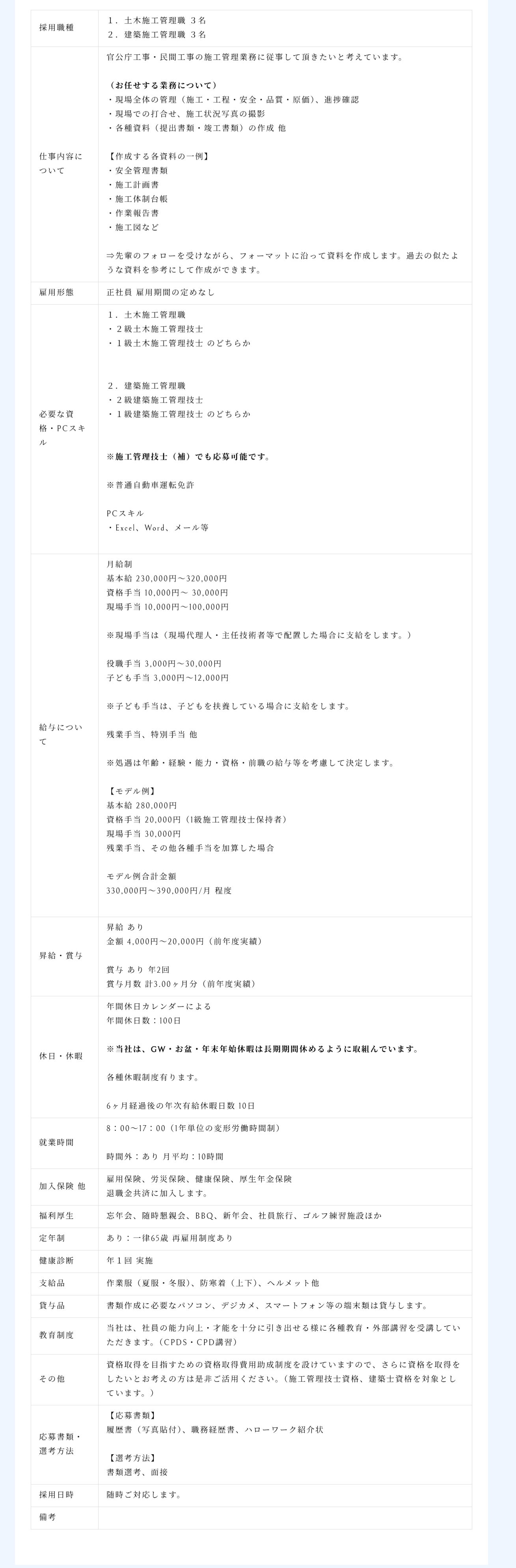 2025.09.23 重要なお知らせ 施工管理職(現場施工管理経験者)を募集します。 施工管理技士資格をお持ちの方で、当社で一緒に働いて頂ける方を募集しております。 ※施工管理技士 補 の資格保持者でも応募可能とします。 中途採用で入社された方も多数活躍しています。また首都圏から地元にUターンをお考え中の方も歓迎いたします。 お気軽にご問い合わせください。