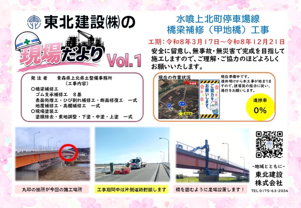 2026.04.27 施工実績 現場だよりVol.1 【水喰上北町停車場線橋梁補修(甲地橋)】 今月から、水喰上北町停車場線橋梁補修(甲地橋)工事の状況を まとめた広報紙を掲載いたします。月1~2回のペースで更新 できればと思います。 また、連休明けから本工事が始まりますので、誘導員の指示に 従い、通行のほどよろしくお願いいたします。