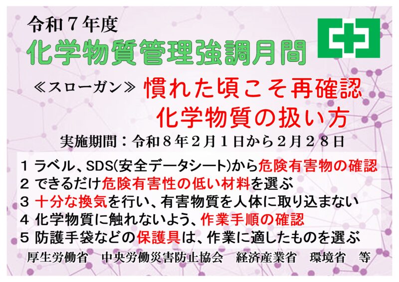 2026.02.02 2月は化学物質管理協調月間です。 2024年4月に施工された「労働安全衛生法に基づく新たな化学物質規制」に基づく強調月間で、昨年2月から実施されています。工事現場内でも多種多様な化学物質を扱いますので、リスクアセスメントの徹底・ばく露防止措置など実施し、安全管理に努めてまいります。